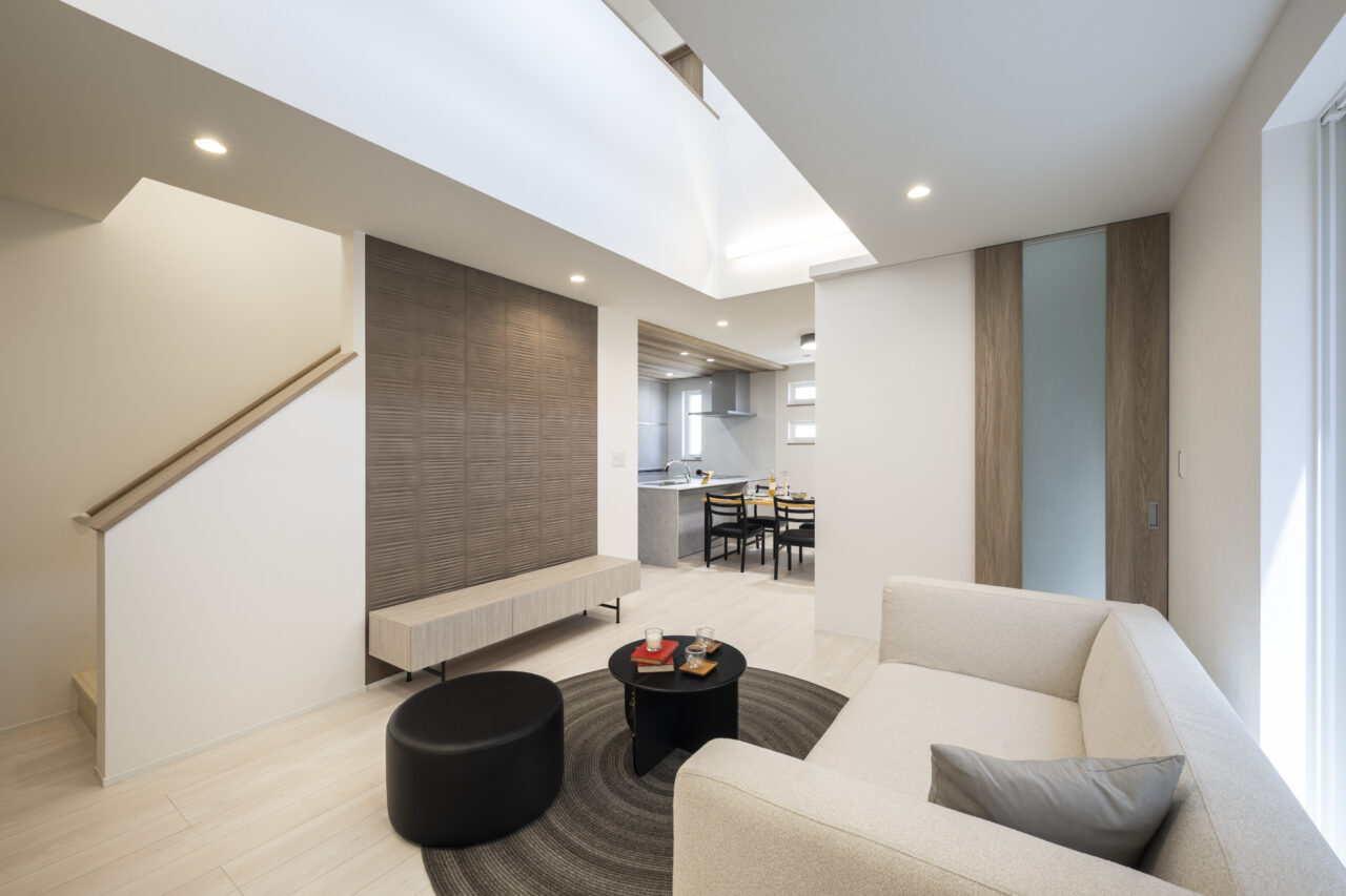 LDKをワンフロアに配し、リビング上の吹き抜けと共に開放的な空間を実現。